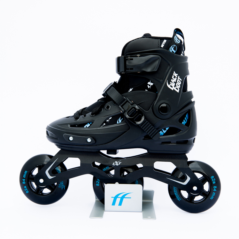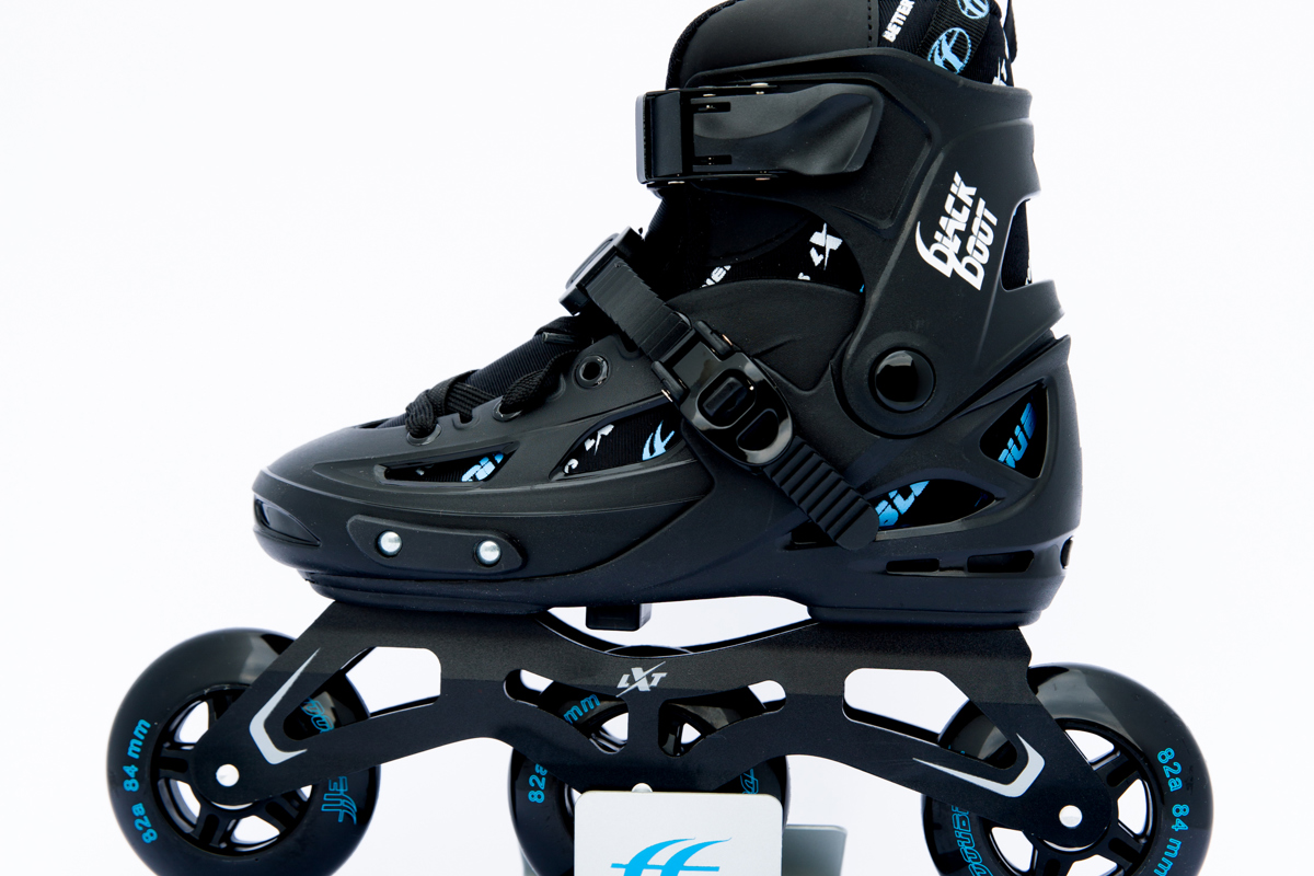 The Aluminum frame in combination with high quality axes, spacers, bearings and wheels provide a “roll” equivalent to the roll of a competition frame and inline skate setup. The unique stepless mechanism for size adjustment causes the boot to be adjustable with millimeter precision. In a few seconds the size of the boot is adjusted to the user.