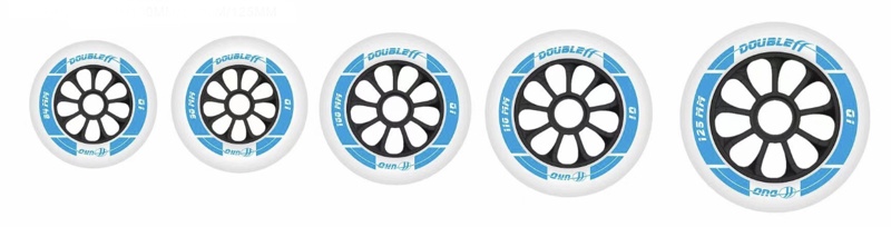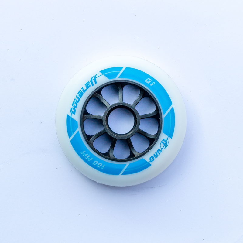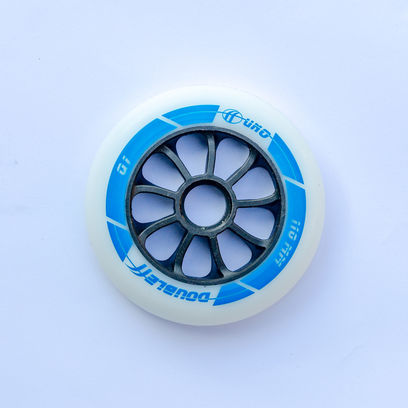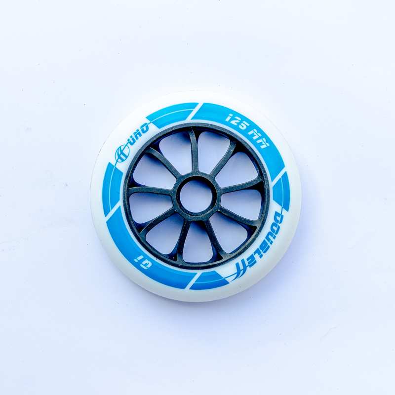 These wheels are perfect for starters in recreative or competition skating. “UNO” represents one, meaning one tire. These wheels have only one tire and no inner tire, leading to a wheel with less “flex” and a slightly harder feeling compared to the DUO wheels with inner tire. These wheels are available in 87/90/100/110 and 125 mm